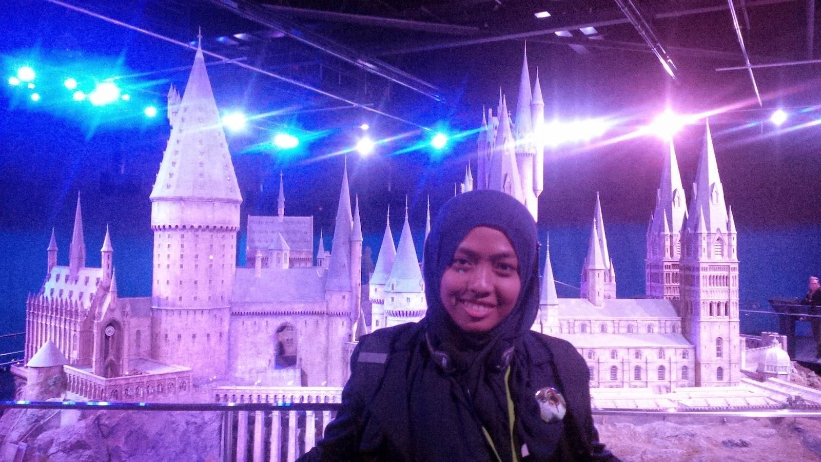 masuk entrance, they entertain us with a movie, so the first section was a placed like cinema. then when the movie ended, the screen rose and there's hogwards door behind it.
